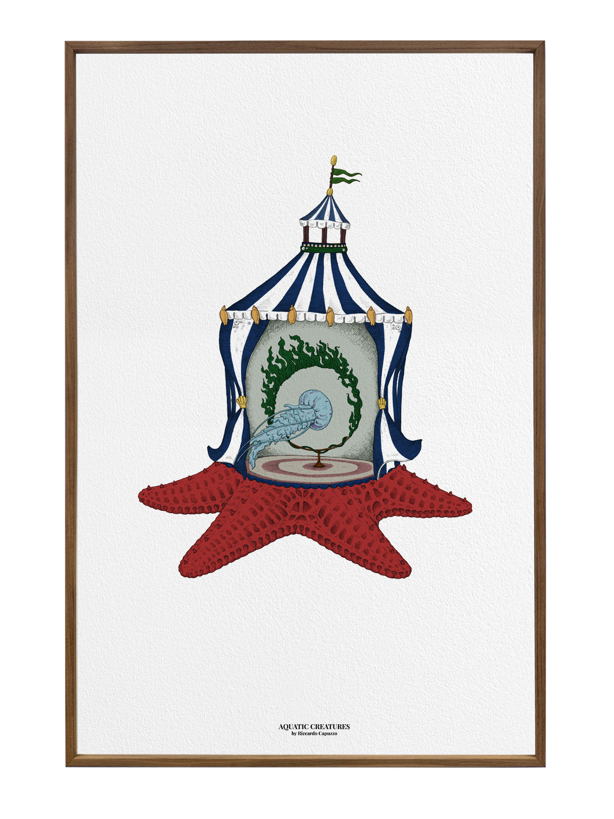 A framed fine art print on Hahnemühle's 100% cotton paper. The frame, made of aluminum and veneered with genuine walnut wood, complements the high-definition illustration preserved behind museum-quality anti-reflective glass.