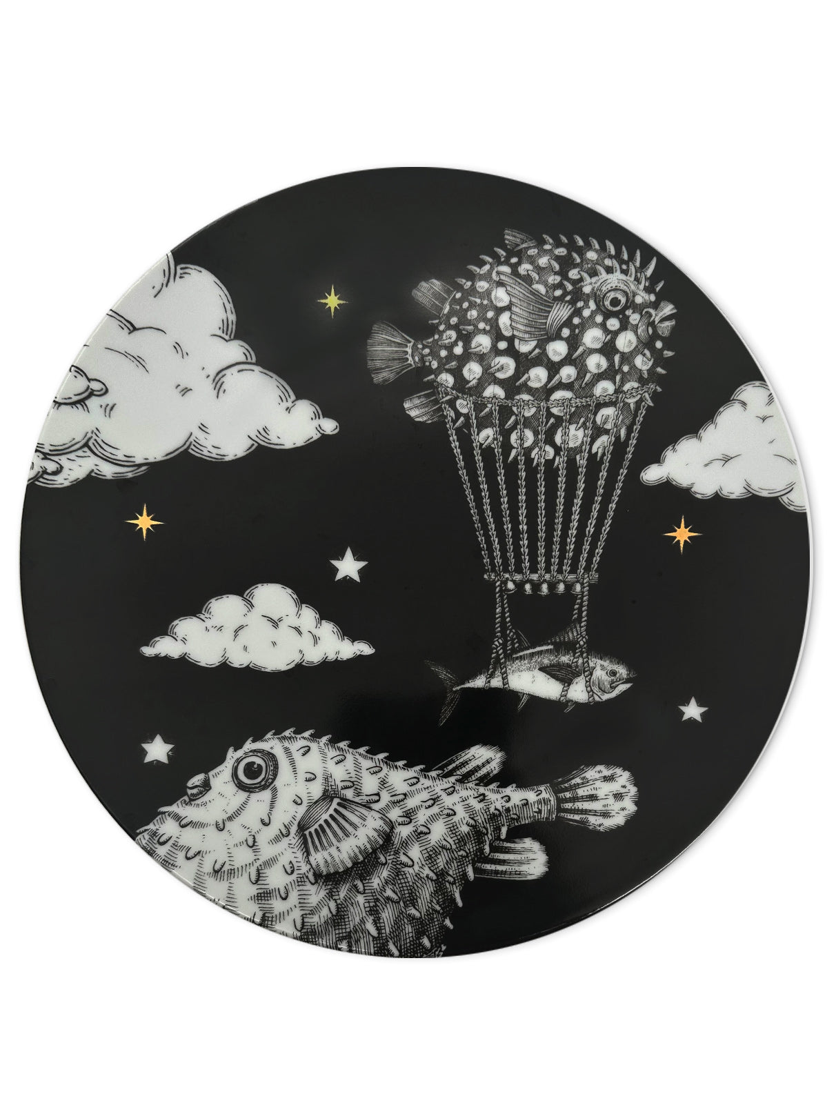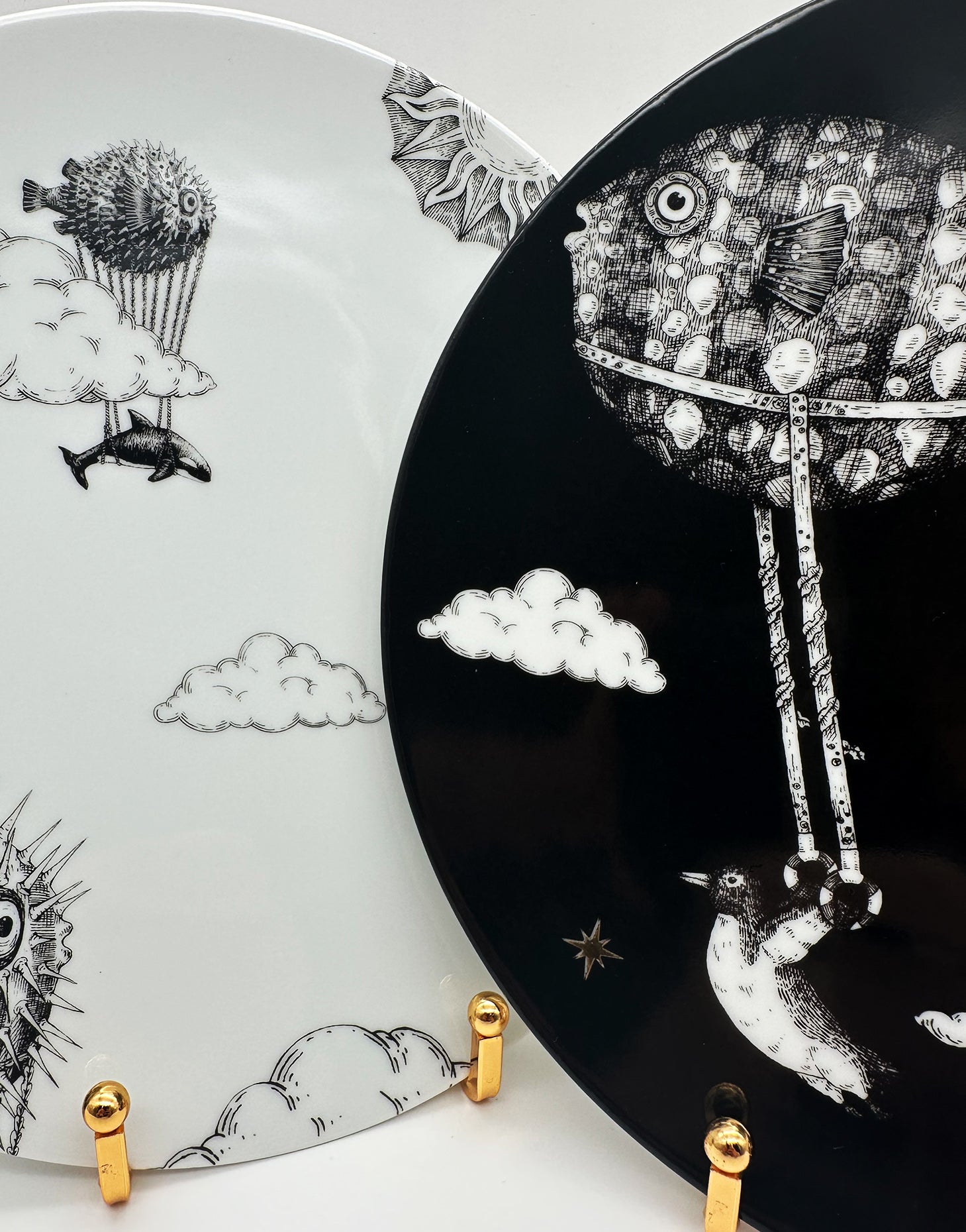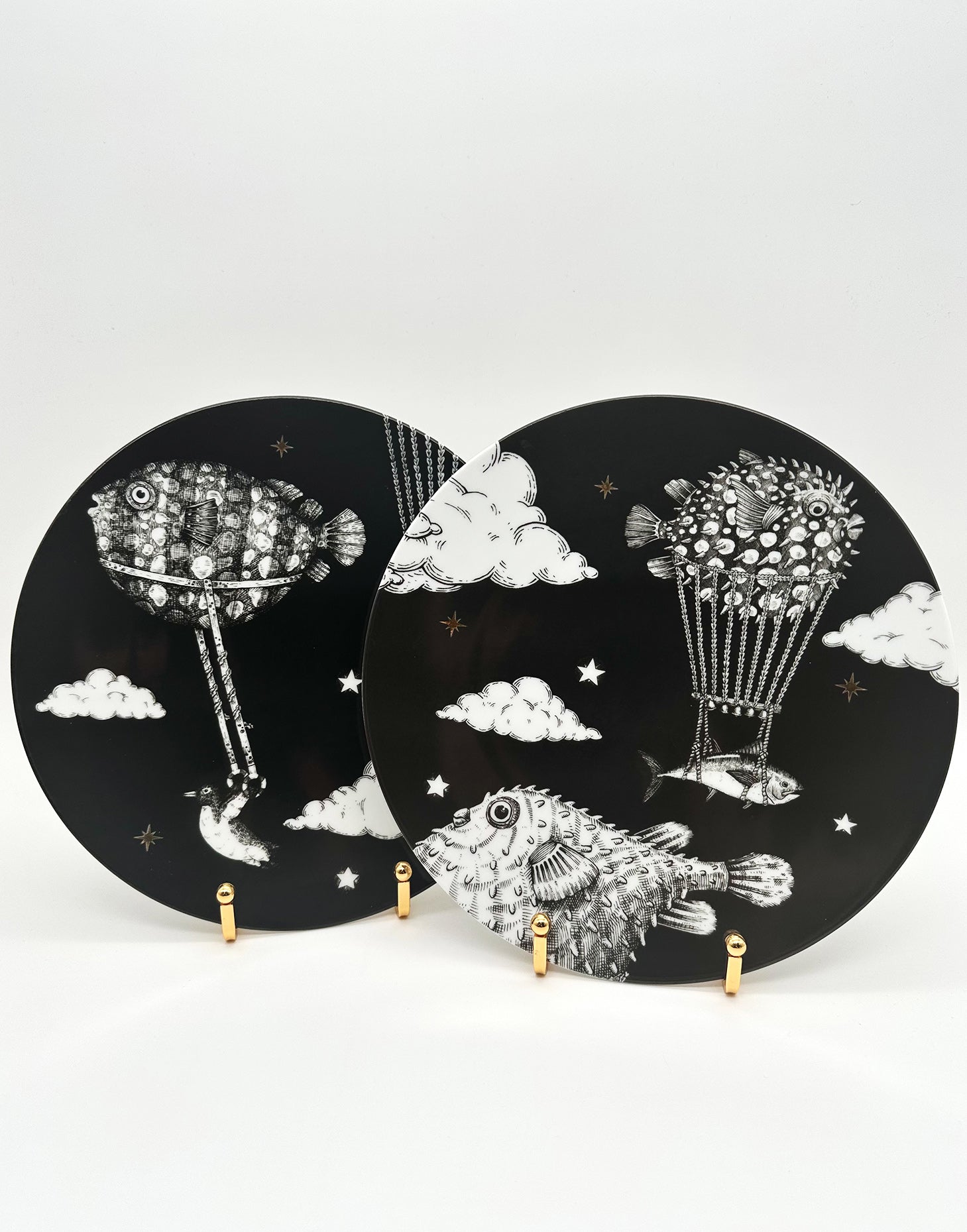 A handcrafted illustration showing a puffer fish carrying its Sailing Fish companion as they soar together across the vast sky, flying over clouds on their journey. This artwork embodies the essence of teamwork and the collective desire to advance together, capturing the adventurous spirit of these marine aerial travelers.