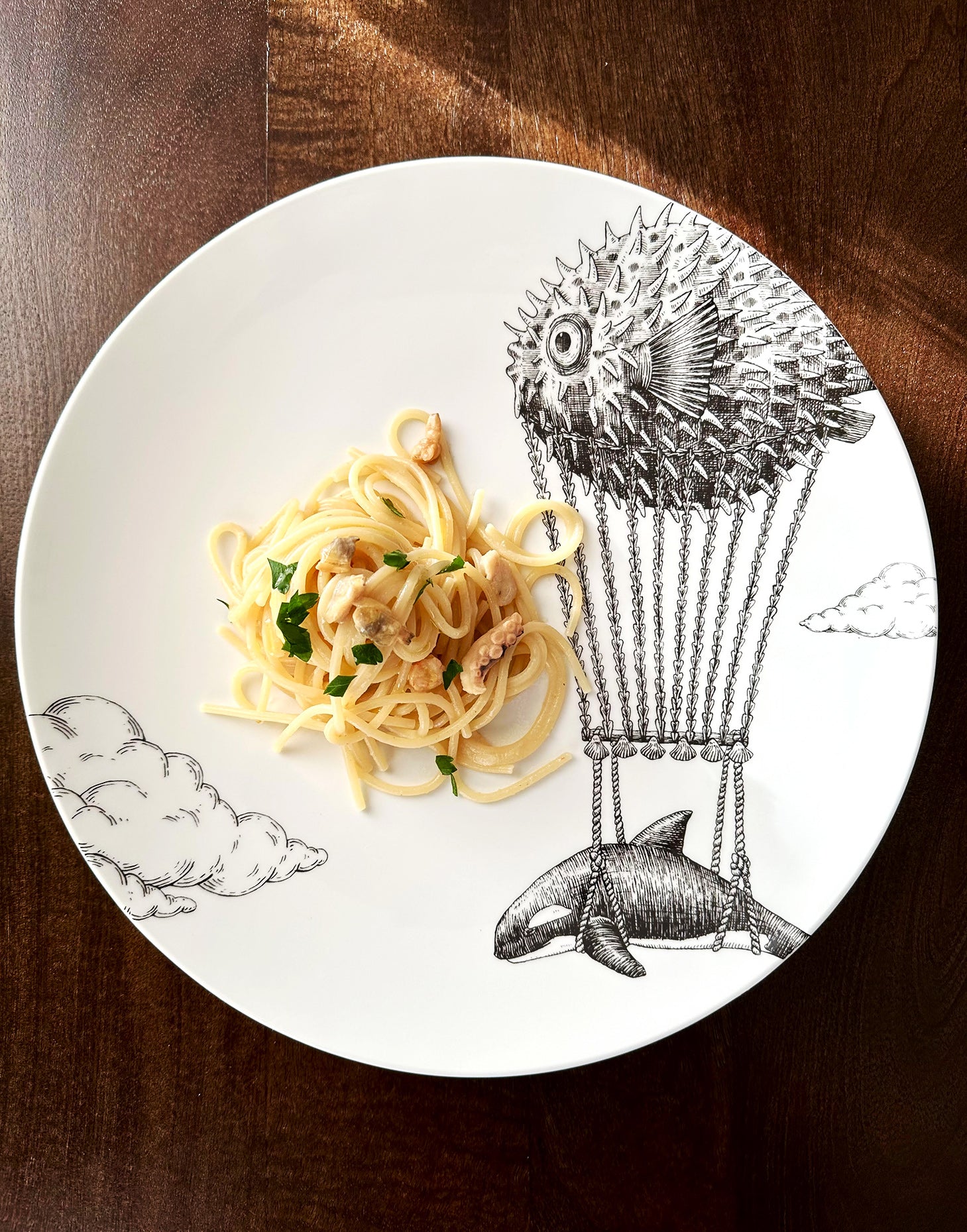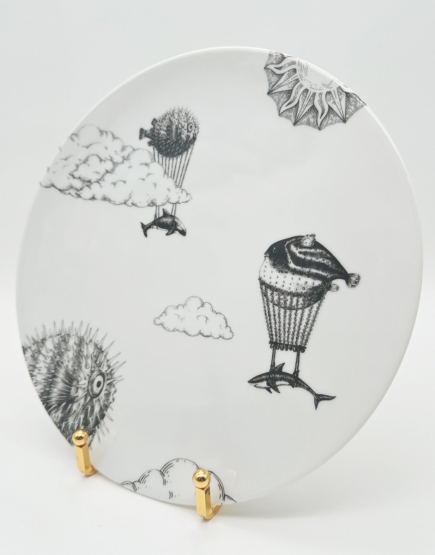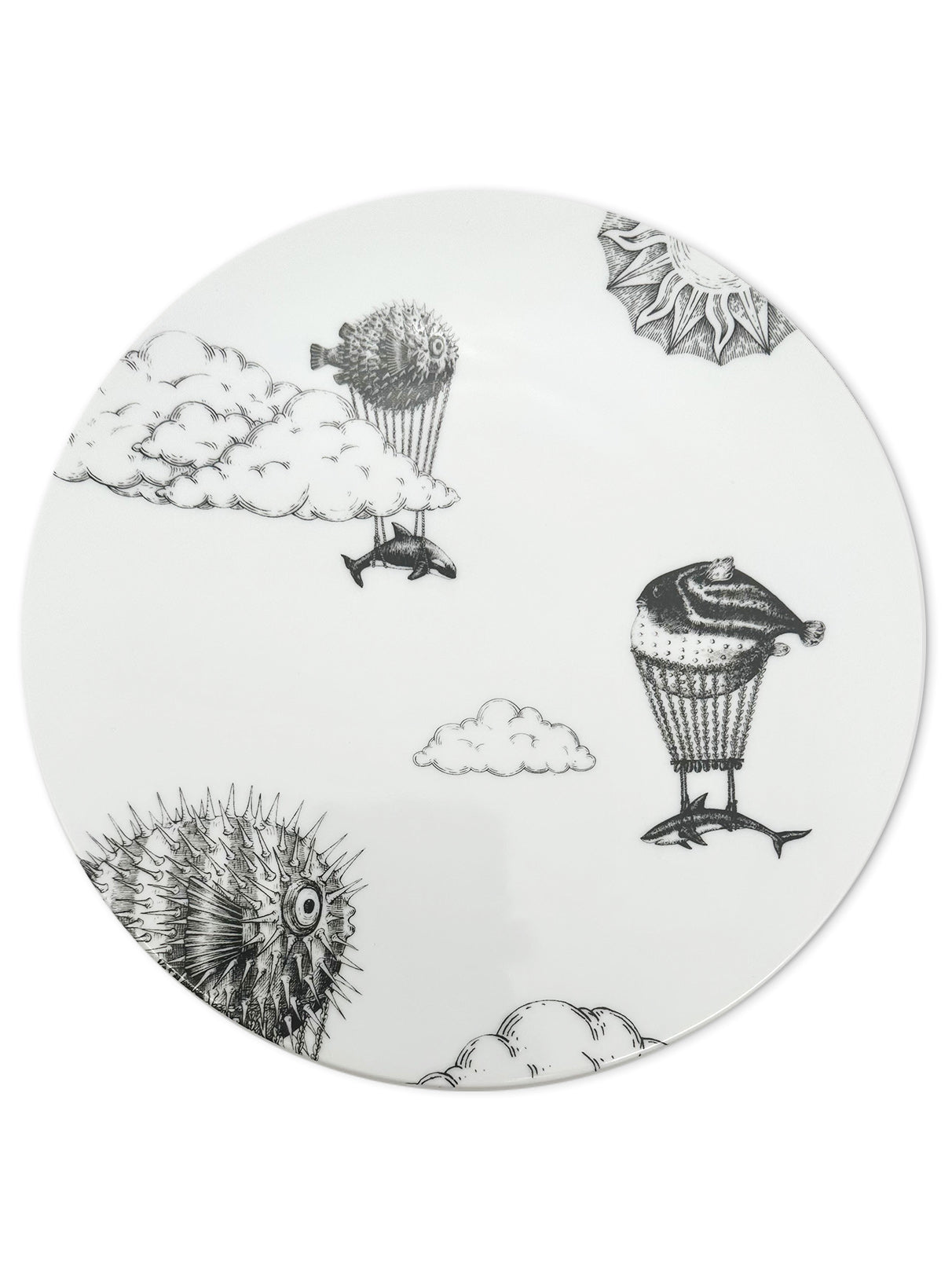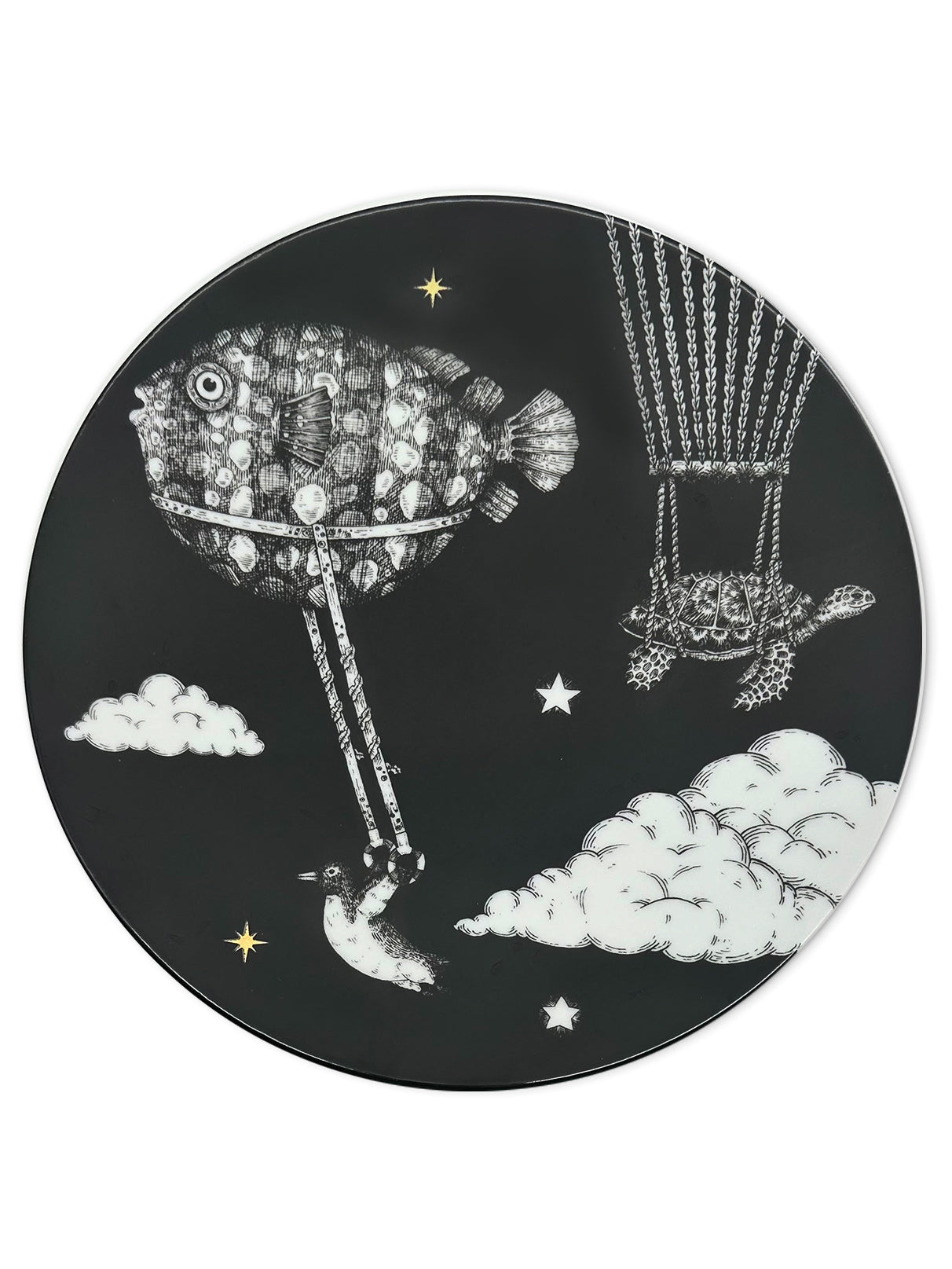A handcrafted illustration showing a puffer fish carrying its Sailing Fish companion as they soar together across the vast sky, flying over clouds on their journey. This artwork embodies the essence of teamwork and the collective desire to advance together, capturing the adventurous spirit of these marine aerial travelers.
