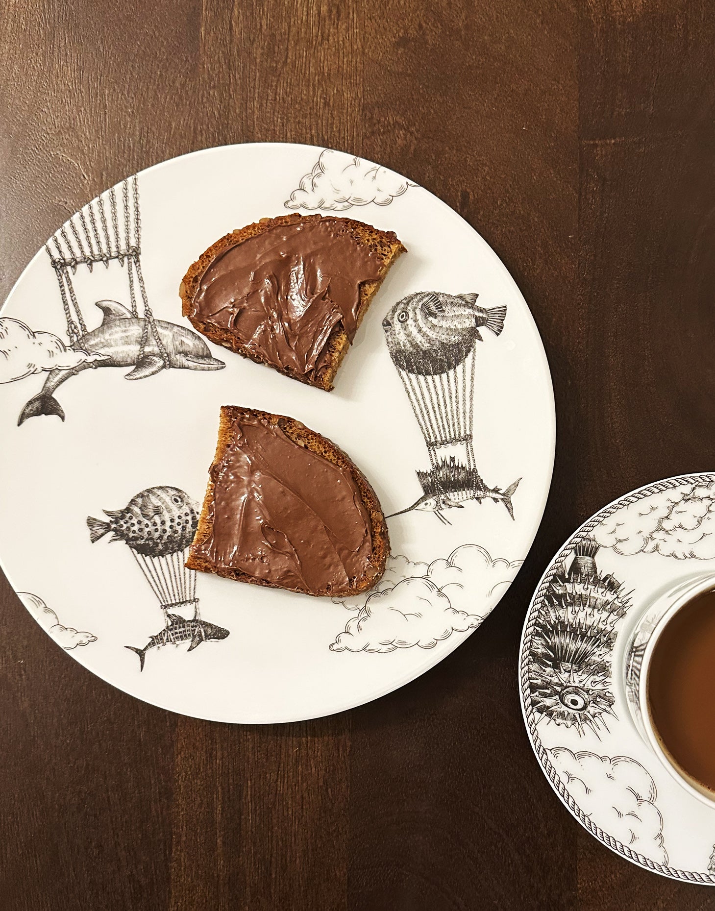 A seascape among the clouds, with friendly duos helping each other soar high. Aquatic creatures, though different from one another, moving forward with a shared purpose in a sunny day.
